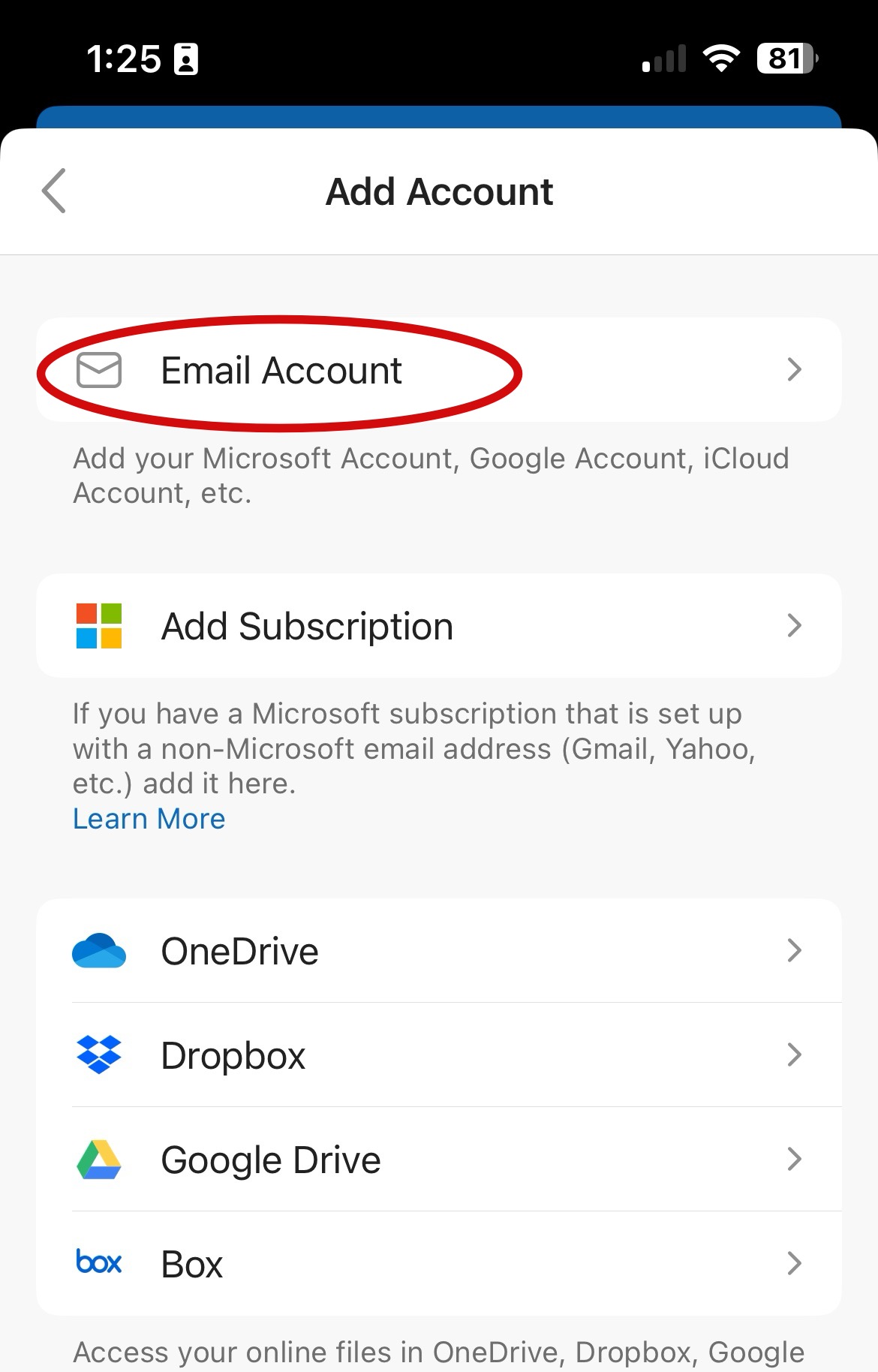 Step 2: Choose the Email Account option at the top of the list.